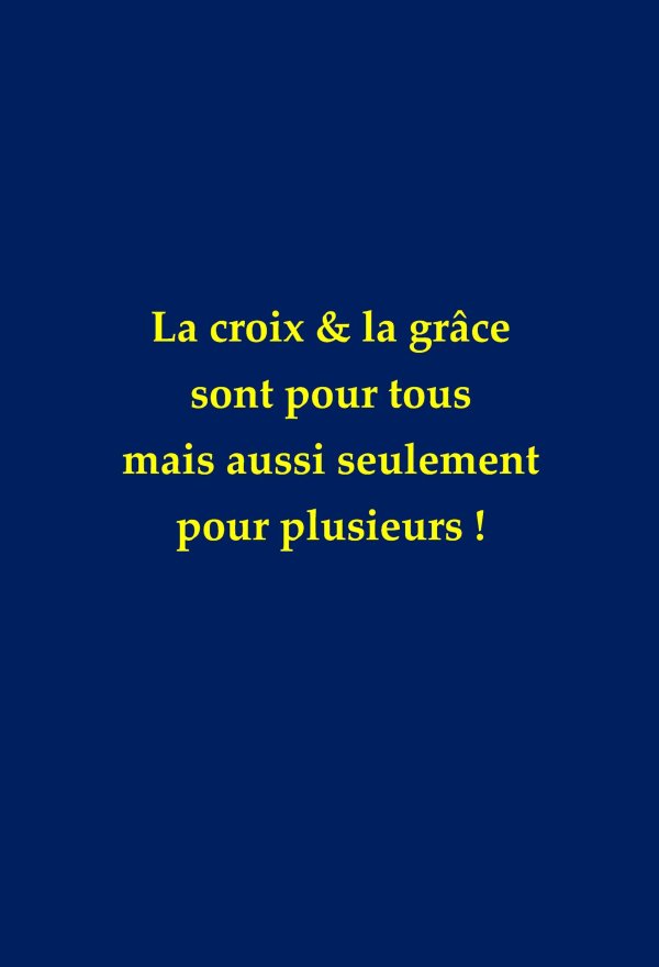 "La croix & la grâce sont pour tous mais aussi seulement pour plusieurs !" [IGW] L'auteur montre clairement que l'effet en vie éternelle de l'oeuvre du Seigneur Jésus à la croix est exclusivement pour ces "plusieurs" qui ont cru (Jean 3 v.14-16 & 6 v.54), mais l'appel de Dieu s'adresse à tous les hommes afin que tous croient et fassent partie de ces plusieurs! |