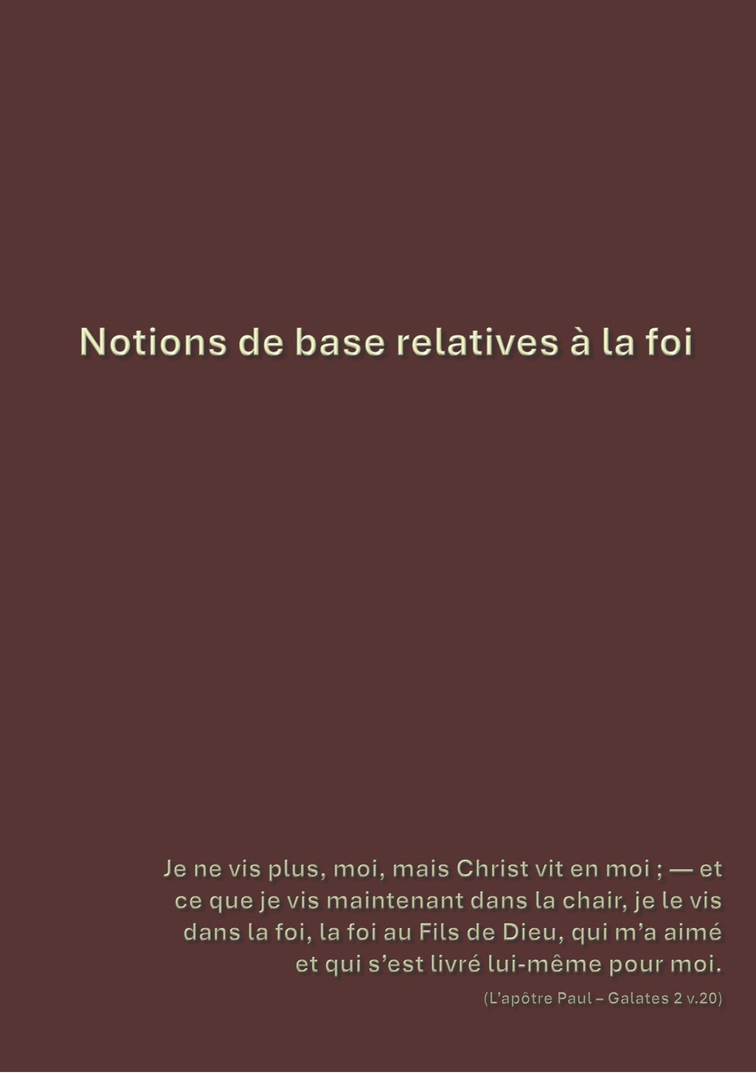 "Notions de base relatives à la foi" Le texte reprend les sujets principaux: le péché dans l'homme - le treavail du Saint Esprit - la nouvelle naissance - le repentance - le nouvel homme - la marche du croyant ... |